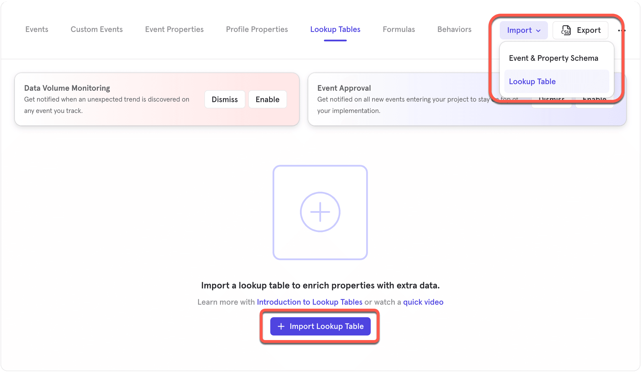 Go to Lexicon > Import > Lookup Table to upload a CSV file or manage existing Lookup Tables. Only project Owners and Admins can create global Lookup Table mapping via the Lexicon. Consumers and Analysts can only create local mappings within reports.